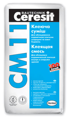 Клеящая смесь Церезит СМ 11 предназначена для облицовки бетонных, кирпичных, цементно-песчаных или цементно-известковых поверхностей плиткой с водопоглощением не менее 1% (это плитки из керамики, фаянса и т.п. размером не более чем 40x40 см). Растворная смесь Церезит CM 11 применяется по прочным недеформируемым основаниям на стенах и полах в жилищно-гражданском и промышленном строительстве, внутри. Для наружных работ, а также для облицовки плиткой с водопоглощением меньше 1 % применять Ceresit CM 11 с добавкой Ceresit CC 83.